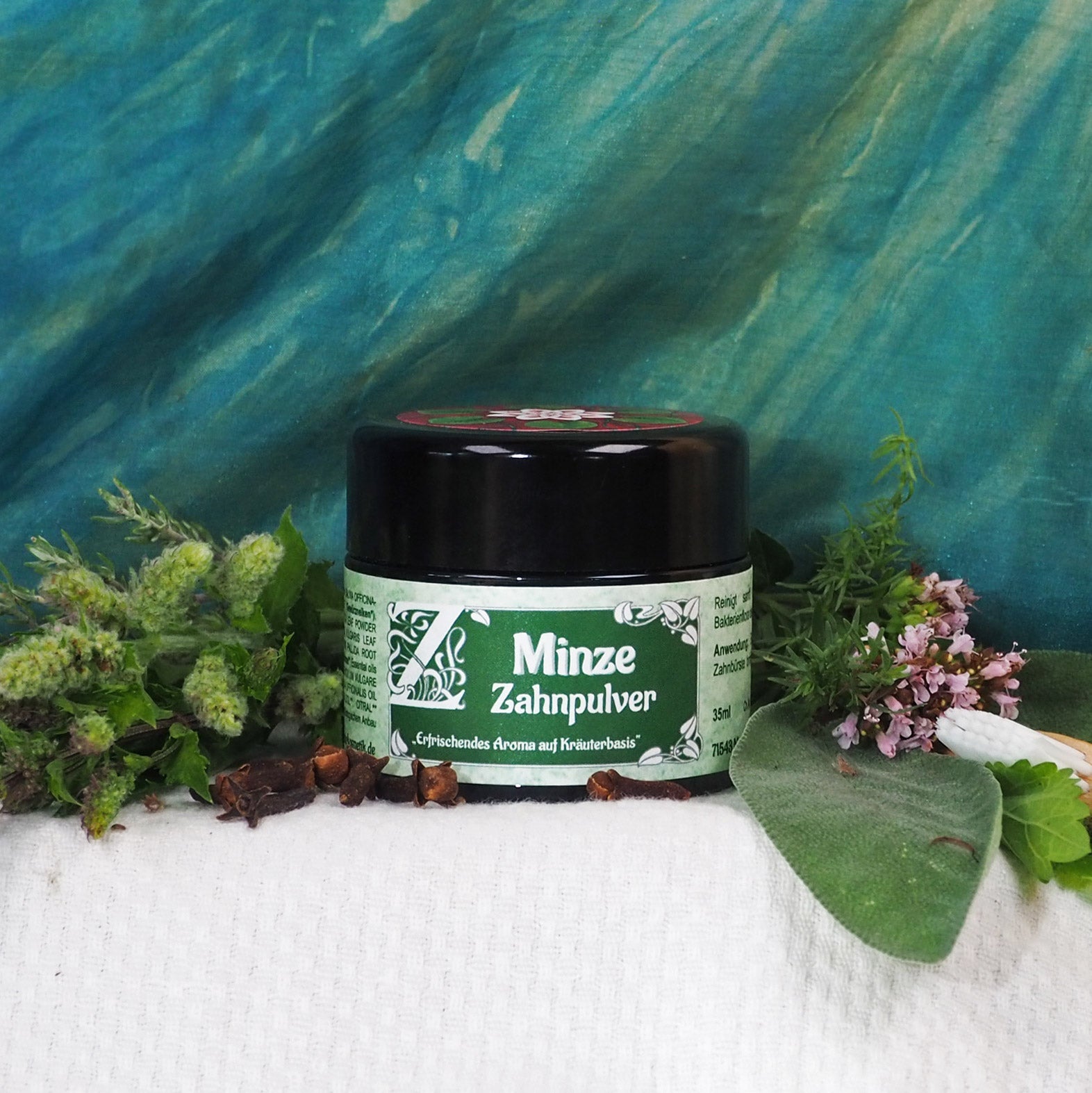Mit dem frischen Duft von verschiedenen Minzesorten. Unser gängigstes Zahnpulver. Altbewährt. Inzwischen eine europaweite große Stammkundschaft.