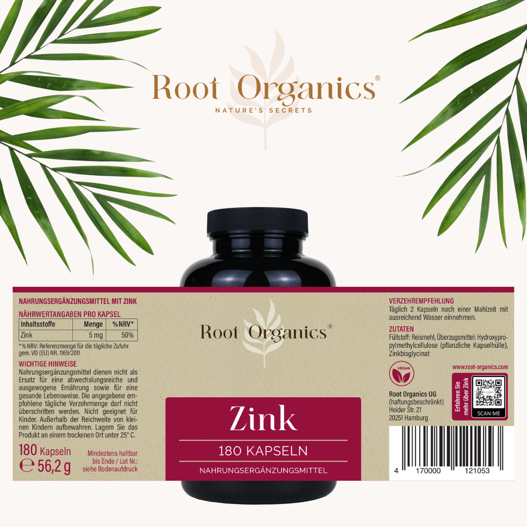 Zink trägt zu einem normalen Immunsystem bei und unterstützt den Stoffwechsel von Makronährstoffen. Unsere hochwertige Zink-Kapseln enthalten 5mg Zinkbisglycinat, das eine optimale Ergänzung für deinen täglichen Bedarf bietet.